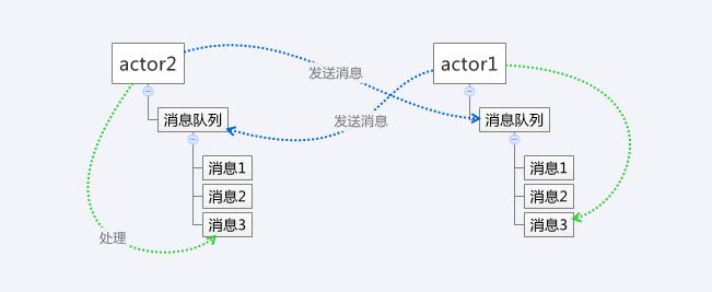 消息传递方式采取的是线程之间的直接通信,不同的线程之间通过显式的发送消息来达到交互目的。消息传递最有名的方式应该是actor模型了。在这种模型下,一切都是actor,所有的actor之间的通信都必须通过传递消息才能达到。每个actor都有一个收件箱(消息队列)用来保存收到其他actor传递来的消息。actor自己也可以给自己发送消息。这才是面向对象的精髓啊!