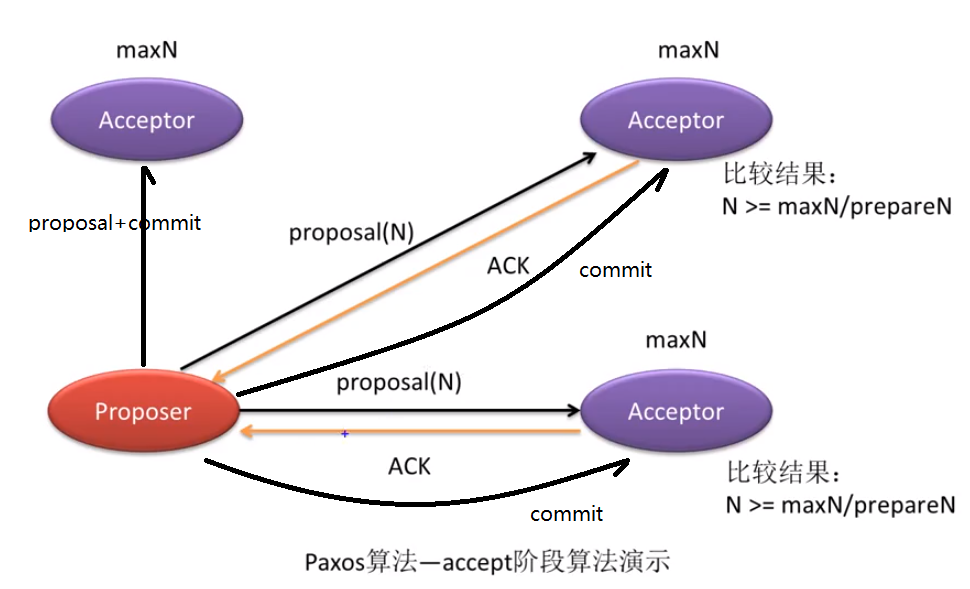 1) 当提案者(Proposer)发出prepare(N)后,若收到了超过半数的表决者(Accepter)的反馈,那么该提案者就会将其真正的提案Proposal(myid,N,value)发送给所有的表决者
