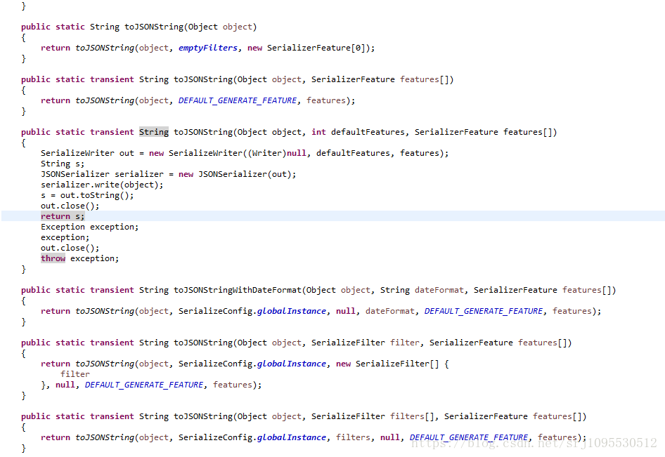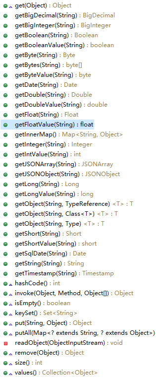类中主要是get()方法。因为JSONObject相当于json对象,所以该类中主要封装了各种get方法,通过”键:值”对中的键来获取其对应的值。且方法的输入参数几乎皆为String类型,这是因为json对象中,”键:值”对的键都是String类型的。